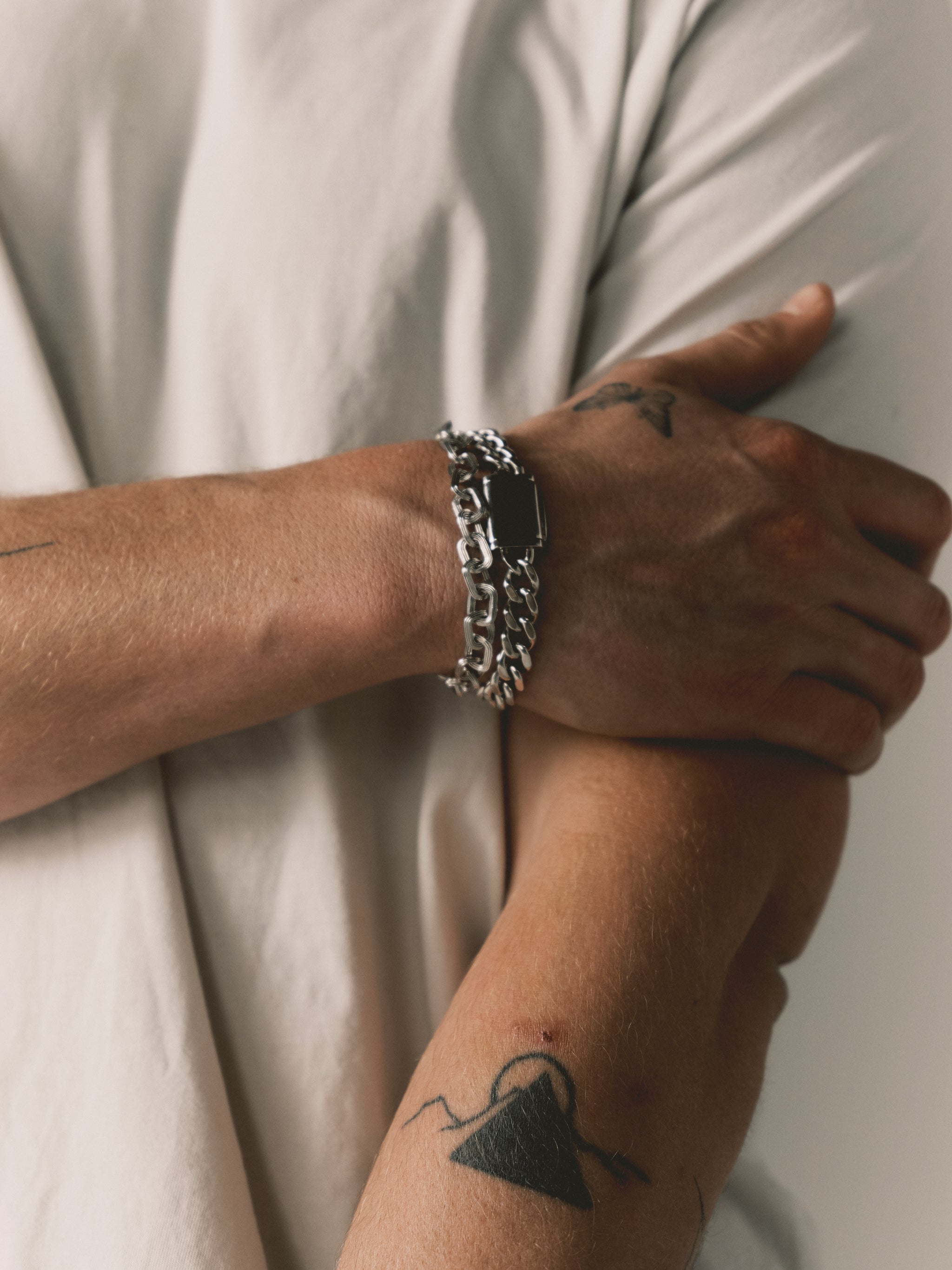 Always start small - if it's your first time trying out multiple bracelets, dainty or similarly weighted layers are a great way to get used to the feeling of multiple bracelets on your wrists. Try the Drew Curb Chain Bracelet with the Stevie Link Bracelet